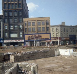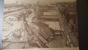 Until recently, the vision in my head of what a McKeesport scene might look like was pretty fuzzy, except that I knew what the train station looked like, and that it was situated on the B&O tracks that cut diagonally through busy downtown streets, where every stopped train would block car and streetcar traffic for blocks. I’ve recently gathered more historic photos of the area around the station and realized it had exactly the kinds of street scenes I want to model: shorter brick buildings housing a variety stores with big signs painted on the bricks or covered in lights. After studying the photos (some of which came from the book McKeesport (Images of America: Pennsylvania), I could start to see where the boundaries of a modeled McKeesport might land, space permitting.