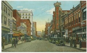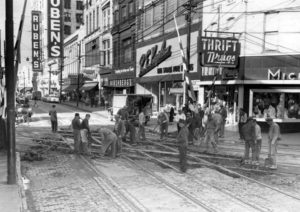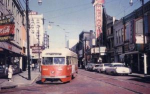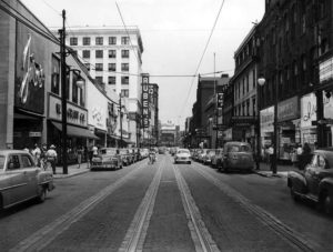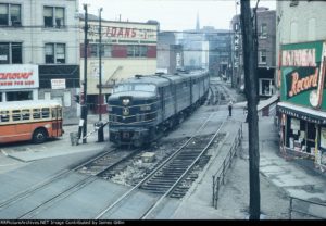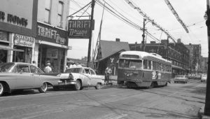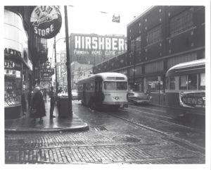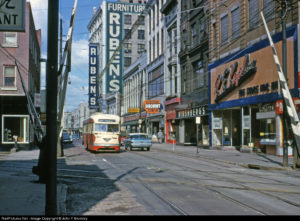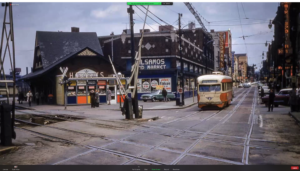 Now that I’ve started taking a closer look at Mckeesport, I realize it’s a pretty important scene, because of its modeling potential. It has exactly the kinds of city street scenes I want to model, with a variety of businesses (furniture, clothing, restaurants, hotels, pharmacies, jewelry, records, groceries, salon, deli, candy, cinema), lots of pedestrian traffic, streetcars and many grade crossings. If I were limited to a very small layout space, I could make a streetcar layout out of just the McKeesport scene, and I’d still be able to incorporate many of the items on my givens & druthers list.