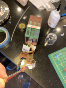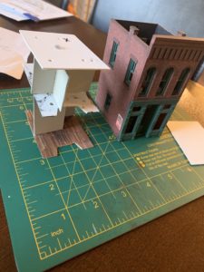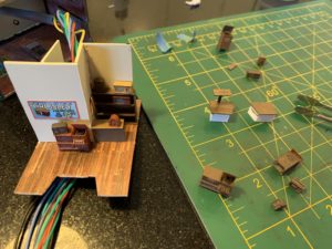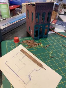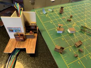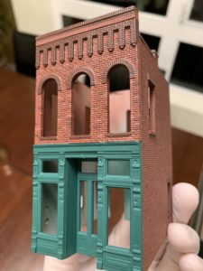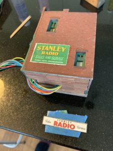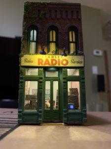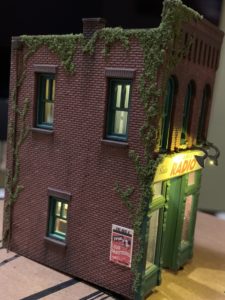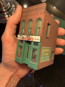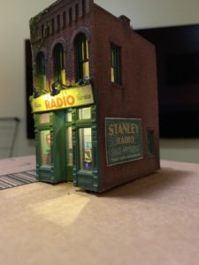 I started this project on January 20, 2019, after purchasing the Design Preservation Models (Woodland Scenics) kit, “Pam’s Pet Shop” at the train show in Puyallup, which was the first structure kit I’d built in 30 years. I initially planned to put a small restaurant and second floor apartment inside, but later decided it was too small for a restaurant, and chose a radio shop instead, which needs very little space, and would help convey the late 1940s era.