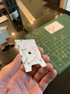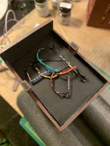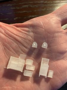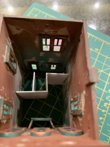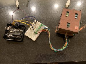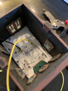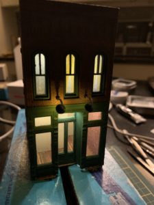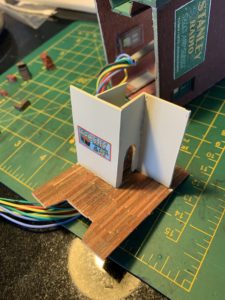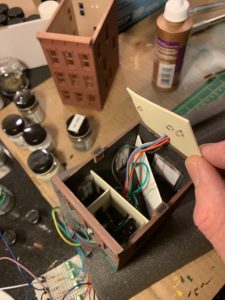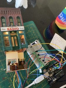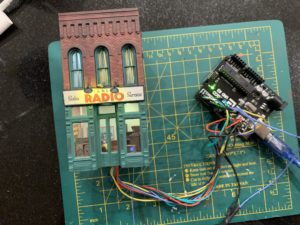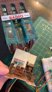 By March 2019, I had started to build interior walls and floors and installed LED lighting, which by April was animated by an Arduino to simulate a 24-hour cycle of lights coming on and being turned off in each room at different times. The animation included a simulated TV flicker effect in the living room of the second floor apartment. TVs were still a pretty new thing in 1949, but they were on the market, and I figured the owner of a radio shop would be the type of person to be an early adopter of the technology, and might have one in his living room. However, when I obtained 3D printed vintage radios, they came with a small vintage TV, and I decided to move the effect to the the TV and place it in the storefront window, Illuminating the tiny screen with a fiber optic filament.