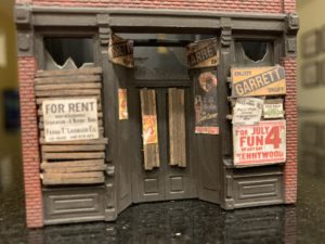 I found one of them particularly appealing, and it had the same basic storefront design as this kit, making it easy to recreate. I liked the broken windows, the grime, the many signs and posters attached to the front, and the fact that two of the posters were for Kennywood and West View, two local amusement parks. The photos were of such high resolution that I was able to read all of the lettering on the signs and recreate them at scale in Illustrator and Photoshop. I completed this model on December 17, 2020.