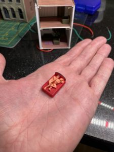 The interior was nearly complete by mid-May, except for bedroom furniture. I had a lot of 3D printed detail parts that I’ve been using for a few years, but no bedroom furniture. I wasn’t ready to place another big Shapeways order, so I looked for cheaper options, eventually finding Lovers in Action, a set from Noch with a bed and two figures getting it on. Soon after, I found an HO scale model of an HO scale 4×8 layout from miniprints.ca, and decided the other bedroom would be a train room. Once that was decided, I went into the Model Railroader magazine digital archive to get a copy of the August 1949 issue. I scaled down the cover and printed it for the coffee table.
