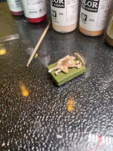 For lighting, I used the same warm white 3-volt LEDs that I used previously in Building 3 and Building 7. There are two LEDs in the front corners of each scene, and they’re wired in three circuits so that each room can be turned on or off independently. I initially applied a light spot of Vallejo Model Air 71.075 Sand to make the lighting a little warmer and dimmer, to set it apart from Building 4, which would be right next to it. I thought it looked good at first, but it made the light a little too dark, so I later cleaned the LEDs off with 91% isopropyl alcohol on a cotton swab.
