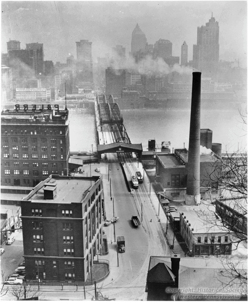 For years, the header of this blog featured just a title and subtitle in plain type over a photo of a pair of Alco PA-1 locomotives on P&LE Train 85 waiting at the terminal in 1949. In June 2024, I was struck with the inspiration to create a title image for this site and my YouTube channel, inspired by the title screens of classic film noir movies. I made it in Adobe Illustrator using the Adobe font ATF Poster Gothic Round. I created film grain effects in Photoshop and placed it over a photo of Pittsburgh’s skyline as viewed from Mt. Washington above Smithfield Street and behind the P&LE terminal, circa 1949, before smoke control measures had a noticeable effect. When I placed the text over the skyline, the smoke wafting from the P&LE’s power plant lined up just right with the title.